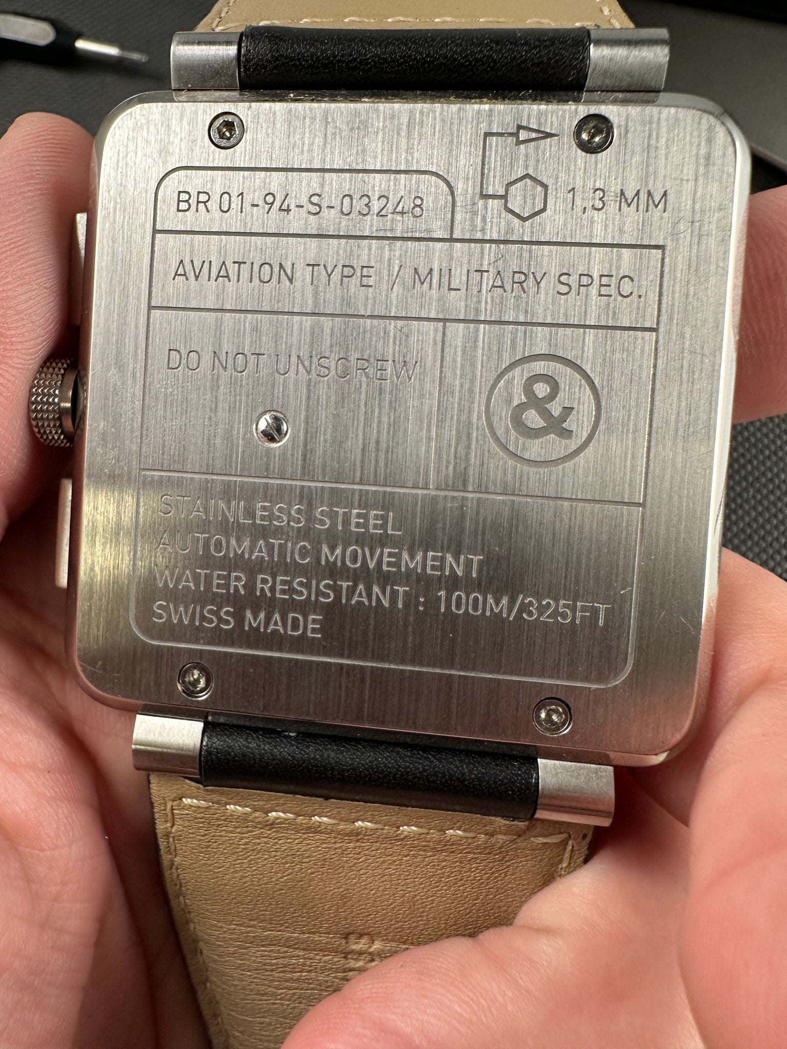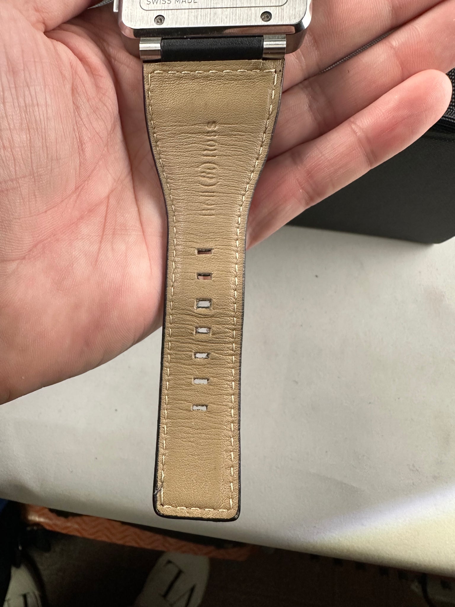 Massive 47mm case on original black leather strap and original steel buckle